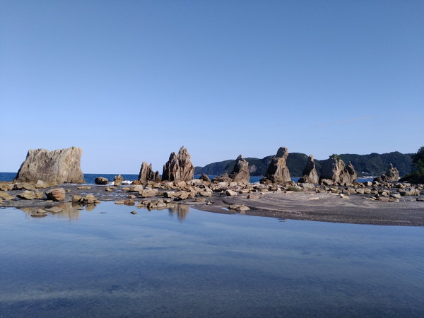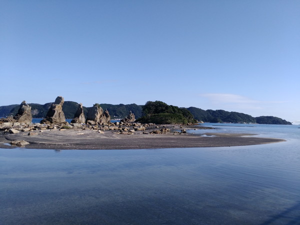 大小40余りの岩が沖に向かってずらりと並ぶ名勝です。直線状に並ぶ姿が橋の杭に似ていることからこの名前が付きました。その昔、弘法大師と天の邪鬼が賭けをして、一夜にして建てたという伝説もあるとか。実際は、海の浸食により岩の固い部分だけが残り現在の形になりました。自然の雄大さを実感しますね。