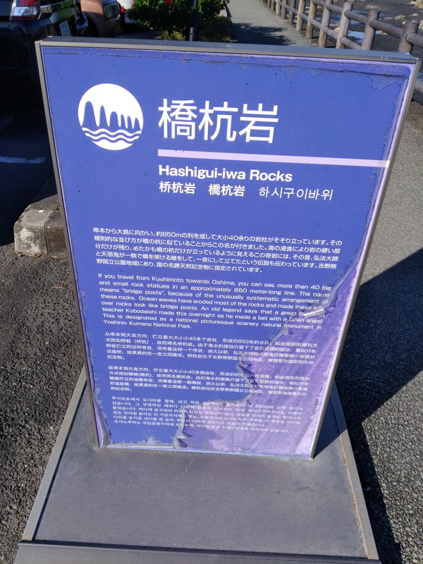 ここからは、今日宿泊するホテルのある、紀伊半島最南端、そして本州最南端でもある串本町に向かいます。新宮市から串本町は約40kmあるんですが、新宮市から途中の那智勝浦町までは無料の高速道路が利用できるので思ったより時間が掛かりませんでした。高速道路を降りてからは海沿いの国道42号線を南下します。串本町に入ってしばらくすると「橋杭岩」という名勝が見れる道の駅(くしもの橋杭岩)があるので撮影タイムです。