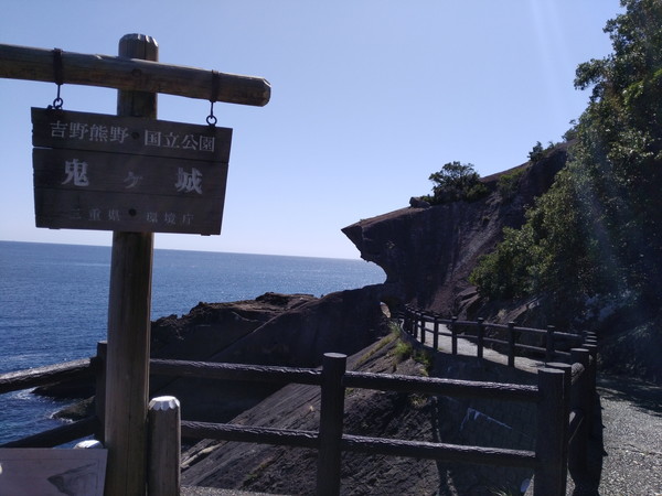 伊勢志摩から始まるリアス式海岸の南端の熊野灘に面し、風化や浸食によって削られた大小の隆起岩が約1.2km続く景勝地です。古くは桓武天皇(737~806年)の頃、この地に隠れて、熊野の海を荒らし廻り、鬼と恐れられた海賊多娥丸を天皇の命を受けた坂上田村麻呂が征伐した伝説に基づいて鬼の岩屋と呼ばれ、後に鬼ヶ城といわれるようになったそうです。