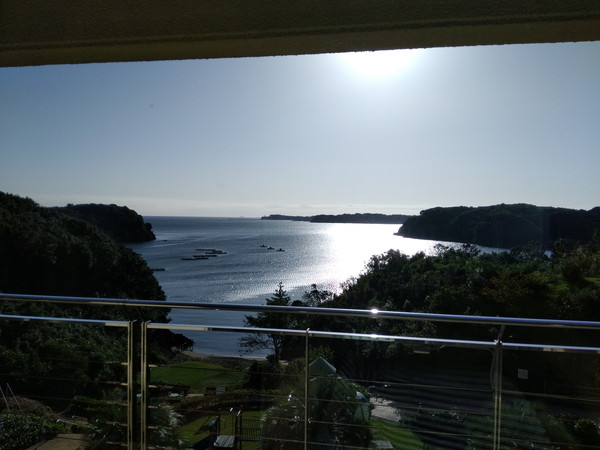 今日は朝から快晴でレストランからの的矢湾の眺めが良かったので、屋外テラスに出て磯辺まで歩いてきました。