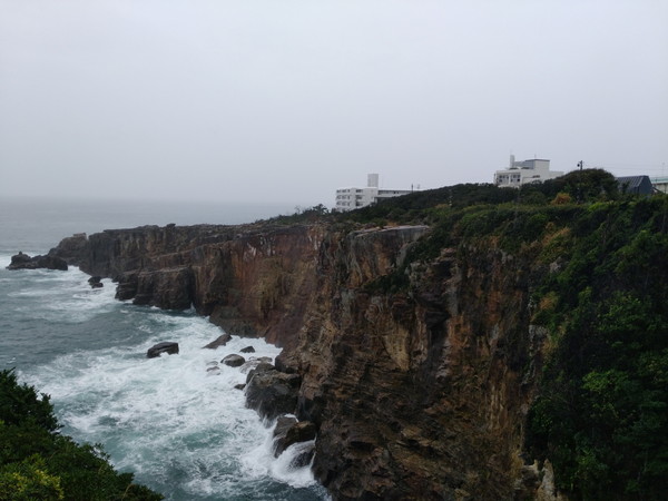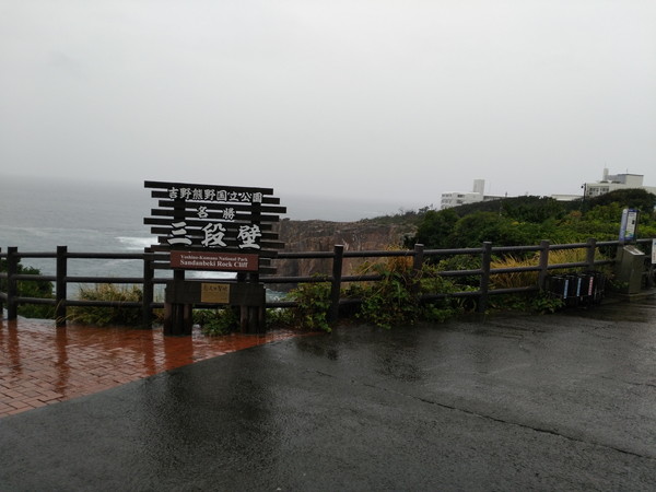 昨日は景勝地「三段壁」近くには無料駐車場がないと思って諦めたのですが、良く調べたら町営の無料駐車場がありました。ただし、駐車できる台数はあまり多くないようなので、どのみち昨日は利用できなかった可能性があります。旅館をチェックアウト後、朝一を狙って行ってみたのですが、悪天候の影響もあるのかガラ空きでした。