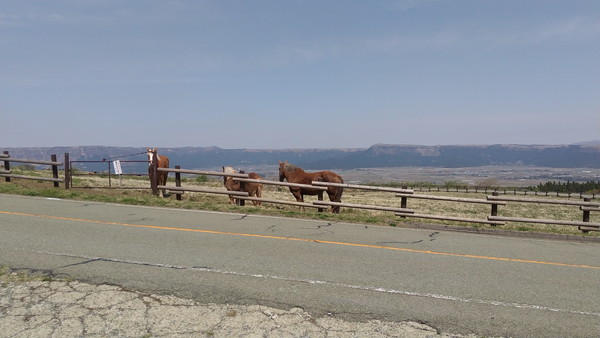 ミルクロードの途中にある阿蘇スカイライン展望所からは阿蘇カルデラの地形や、阿蘇五岳を一望できます。遠くは少し霞んでいるのですが、この景色が見たかったのでレンタカー借りてまで来た甲斐がありました。