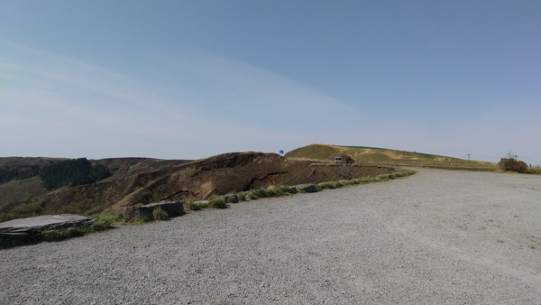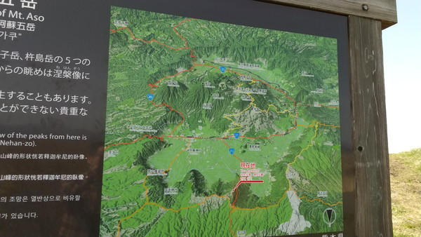 大観峰頂上の標高は936m、ミルクロードに入る手前の大津町の標高が50mですから、短時間で一気に登ってきたことが分かります。