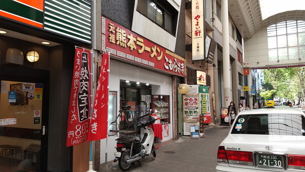 お昼は熊本のご当地ラーメンを頂きます。事前に調べたところ「こむらさき」さんと「天外天」さんの2つが候補になったんですけど、後者は夕方からの営業だったので時間が合わず、前者の「こむらさき」さんにしました。ホテルからは徒歩で約10分の距離です。