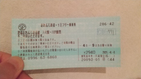 次に切符ですが、川内駅~八代駅は約100km、約2時間半と大変長い路線なんですが、通常の切符を買うと途中下車できないようです。元々途中下車の予定はないのですが、これだけ長い路線だと急遽途中下車したくなる場合も考えられたので、一日フリー乗車券を購入しました。名前の通り、当日限り川内駅~八代駅間を何度も乗り降りできます。通常の運賃が2,670円に対し、一日フリー乗車券は2,940円とそれほどの金額差がないため、仮に途中下車しなくても痛くありません。この乗車券は鹿児島中央駅の窓口で購入できました。購入した際は、窓口の係員さんはJRの駅で発券できるか分からず、奥の方の詳しい係員さんに聞きに行ったりしていたので、レアケースだったのかもしれません。