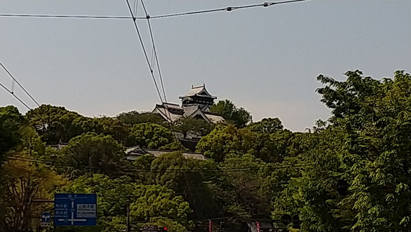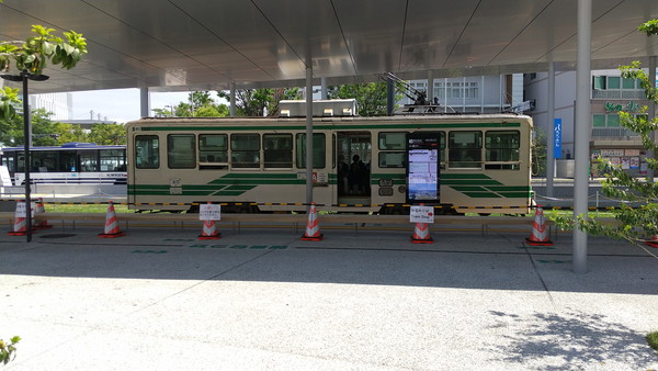 荷物を預けるために予約したホテルに向かいます。ホテルのある熊本市中心部は熊本駅から約3km離れており、徒歩で移動するのは難しいので市電を利用します。市電は混雑していて、荷物を持ちながらだと乗るのが大変でした。