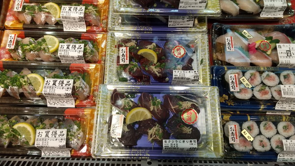 別府に到着すると雨は止んでいたんですけど、今日はもうこれ以上観光する気力が無くなってしまったのでホテルでゆっくり過ごすことにしました。夕食についても外食する気分ではなかったので、別府駅すぐ近くのスーパー「マルミヤストア別府駅前」で調達しました。結構大きなスーパーなので品揃えが良く、生クジラの握り寿司などの珍しい商品も置いてありました。
