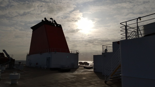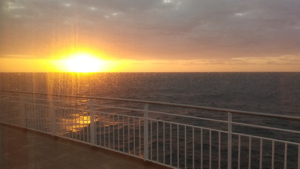 再び目が覚めると、ちょうど日の出の予定時刻の5時半過ぎだったので、外の様子を見に行きます。外は大分明るくなってきており、パブリックスペースの椅子でボッーとしながら外の景色を眺めているとお日様が出てきました。天気は曇りなんですが、幸運にも水平線近くは晴れており日の出を拝むことができました。洋上から眺めるお日様もいいものですね。