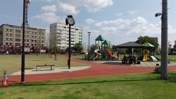 観光バスで鹿児島中央駅に戻ることもできたのですが、市電に乗りたかったので、途中の鹿児島駅(かんまちあ)前で下車します。「かんまちあ」は鹿児島市上町ふれあい広場」と「上町の杜公園」を合わせた愛称だそうです。