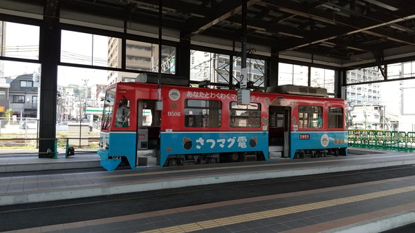 JR鹿児島駅の隣に市電の停留場「鹿児島駅前」があります。車両はひと際目を引くラッピング電車「さつマグ電」でした。これは市内の大学・短大・専門学校の学生さんたちによる「マグマシティ市電デザインプロジェクト」でデザインしたものらしいです。