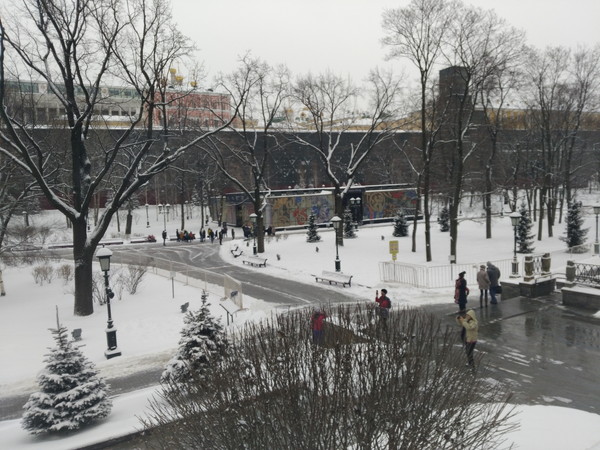 9時にロビーに集合しクレムリンに向けて出発します。休日の朝ということもあり、道路は比較的空いています。モスクワの街並みは近代化された大都市という感じであまり面白みはありませんが、クレムリン近くになると雰囲気のある建物がポツポツと目に入ってきます。