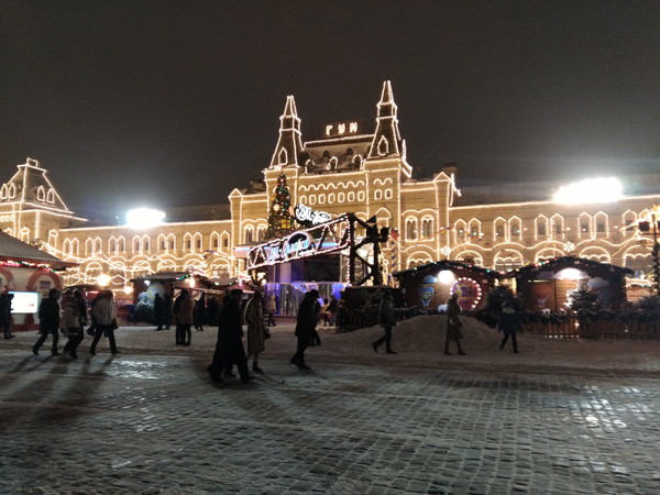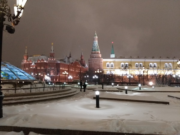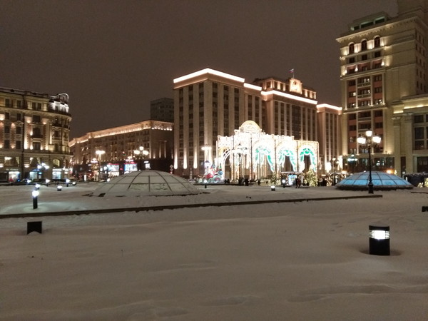 マホーヴァヤ通りでバスを降り、マネージナヤ広場を通って赤の広場に向かいます。夜10時を過ぎていたこともあり若干眠くなっていたのですが、素晴らしい景観を目にし一気にテンションが上がります。辺り一面ライトアップされており、雪景色と合わさった美しさは表現のしようがありません。そして大きい!サンクトペテルブルクでもそうだったんですが、建物や広場のスケール感が一回り大きいです。このスケール感の差は日本という島国と大陸の違いから来るものなのでしょうか。今回のツアーではモスクワを重視していなかったので、期待値があまり高くなかったこともあるのですが、いい年したおっさんが珍しく感動してしまいました。