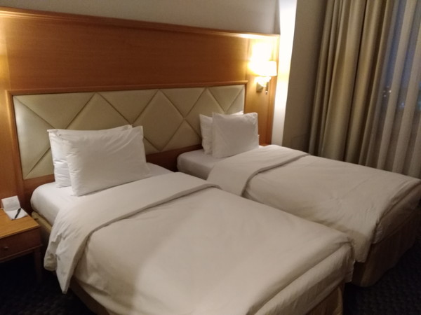 部屋の内装は若干古く、サンクトペテルブルクのホテルと比べるとスペースも小さく感じますが、一人で利用する分には十分です。ウェルカムドリンクとしてミネラルウォーターが2本ありましたが、片方は炭酸水でした。