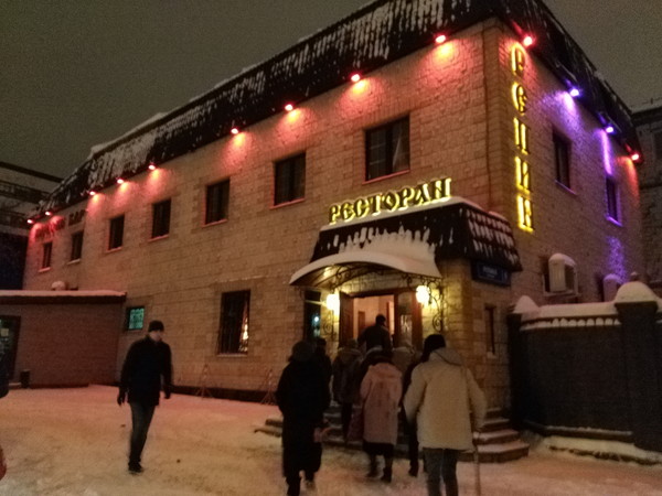 空港から外に出ると少し雪が降っており肌寒く感じます。バスに乗り込みモスクワ中心部に移動します。道路は大渋滞になっており大都市に来たという実感が湧きます。約40分ほど移動したところで、レストラン「Репин(Repin)」で夕食を頂きます。