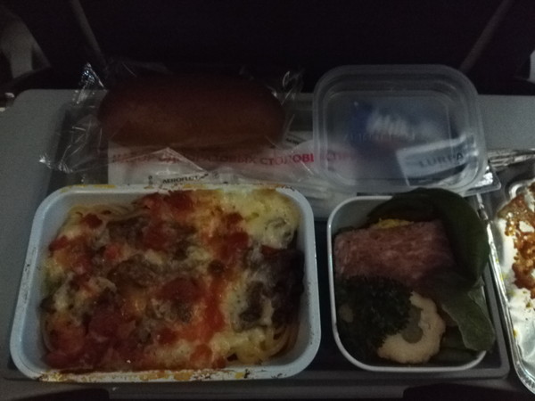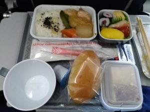 離陸後の1回目の機内食です。特段美味しいとは思いませんが、普通に食べられました。寿司とサラダが一つの器に入っているのがいかにも機内食といった感じです。飲み物については、ビールはなくアルコールはワイン(赤、白)のみでした。日本人ガイドさんによると、アエロフロート(ロシア)は基本アルコールNGとのこと。
