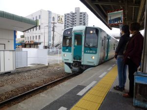 時刻表を見ると、ここも1時間に1本しか電車がありません。次の電車まで50分ぐらいあるので、昼食取れそうな店を探しましたが、餃子の王将ぐらいしかありません。昨日食べなければ良かったと後悔しましたが、2日連続はさすがに厳しいので、仕方なくコンビニでおにぎりを買って駅の待合室で食べました。しばらくすると、徳島駅行きの電車がやってきました。なんと、1両編成です。