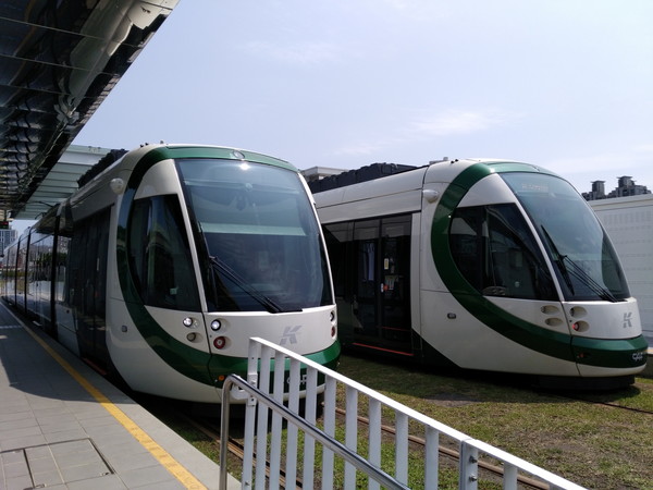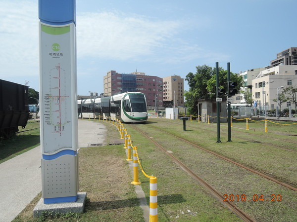 電車の出発時刻まで少し余裕があったので、興味のあった高雄ライトレールを見に行きました。高雄ライトレールは高雄MRTが運営する次世代型路面電車で、高雄市内を一周する環状線になる予定であり、現在第一段階として籬仔内駅~哈瑪星駅が運行しています。