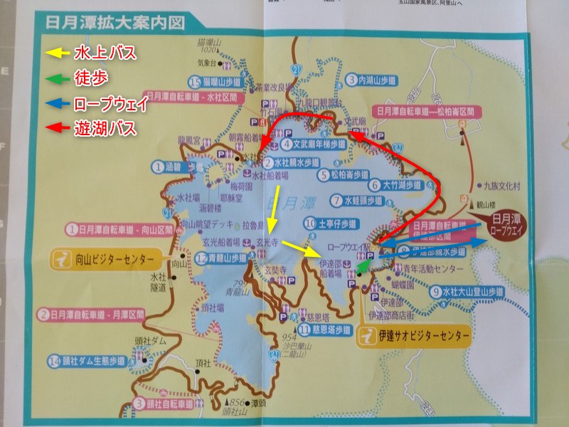 予定より若干遅れて水社遊客中心(ビジターセンター)前のバス停に到着です。バスから降りると現地スタッフと思われる一行が寄って来て観光ルートなどの説明をしてくれました。教えてもらった通り、まずは水上バスで玄奘寺(玄光寺)→伊达邵(伊達部)の順に回ってみることにしました。水社碼頭はビジターセンター裏の道を進むと物産館があり、この建物を抜けたところにあります。