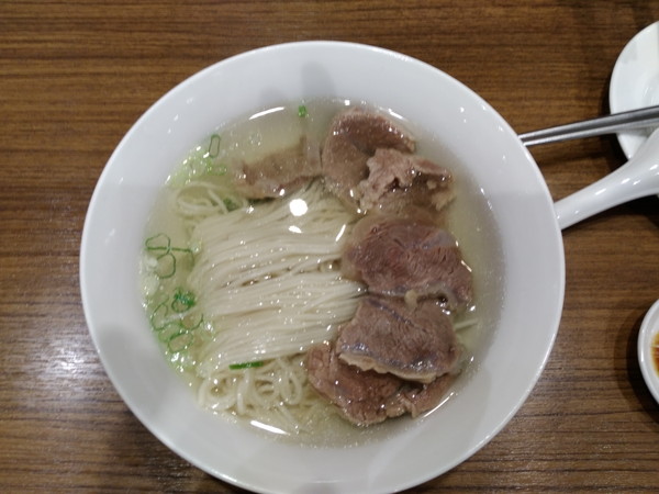 kaohsiung din tai fung noodle soup with mustard greens and shredded pork