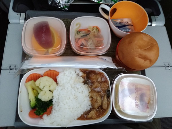 離陸後しばらくすると、機内食が配られました。チキンとフィッシュの選択肢があり、こちらはチキンの写真となります。