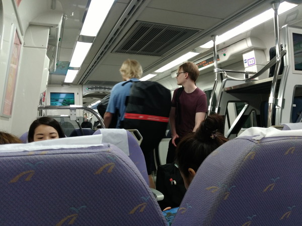 MRT空港線は各駅停車の普通列車と快速列車があり、朝6時から夜11時まで15分間隔で運行しています。空港へ移動する場合は快速列車一択です。平日の比較的空いていると思われる時間帯ですが、車内は思ったより混んでおり立っている乗客もいました。