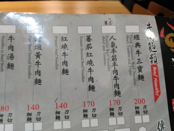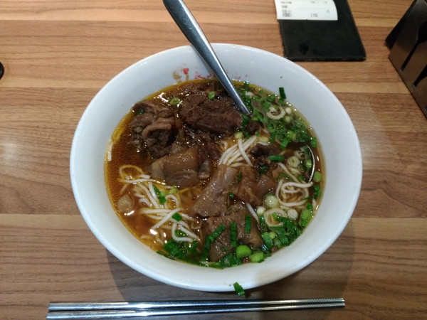 今回は「人気半筋半肉牛肉麺」を頂きました。170台湾ドル(640円)です。麺は細麺と太麺から選べますが今回は細麺を選択しました。名前に人気と冠しているだけあって、万人向けのオーソドックスな牛肉麺でした。個人的にはスープが私好みの薄味でGoodです。