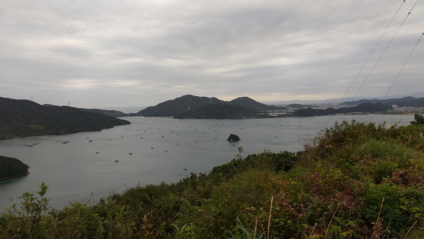 展望台からの眺めは最高でした。ウチノ海は湖にしか見えないんですけど、れっきとした海なんですよね。ウチノ海は絶好の漁場であり、波が穏やかでうねりが少ないため筏釣りに非常に適した環境なんだそうです。写真からも分かる通り沢山の筏が見えますよね。