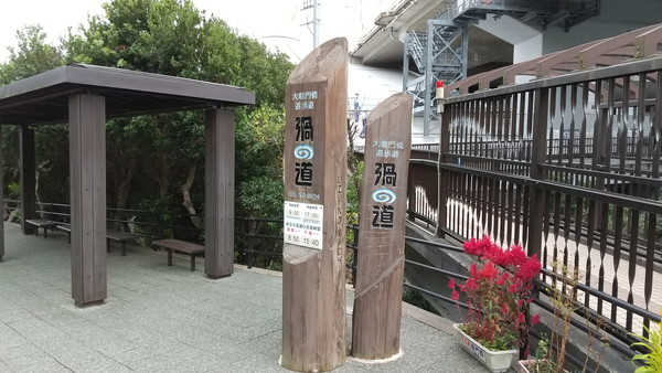 陸橋を渡った後は、勾配のある道路を下ると「渦の道」がありました。渦の道は、大鳴門橋の車道下に設置された海上遊歩道で、約45mの高さから渦潮を覗き込むことができます。今回は渦潮の時刻には少し早かったこともあり、入館するのは見送りました。