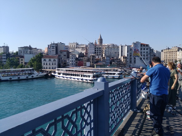 空腹が満たされたので、ガラタ塔目指して歩きます。まずはガラタ橋を渡って新市街に向かいます。ガラタ橋の上では金角湾を眺めたり釣りをしたり各々好きなことをして楽しんでいる人が大勢いました。ここの素晴らしい景色を楽しみながら時間を潰すのは最高の贅沢だと思います。