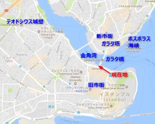 ひとまずエジプシャンバザールには目もくれず桟橋の方に向かいます。イスタンブールに来たら真っ先に行きたかった場所です。現在地である旧市街はビザンチン帝国時代の首都コンスタンチノープルがあった地域で、多くの歴史的建造物が集まっています。金角湾を挟んで向こう岸は新市街で、ビザンチン帝国時代、オスマン帝国時代は外国人居留地でした。そして、正面に見えるのは新市街のシンボルであるガラタ塔で右手にあるのはガラタ橋です。