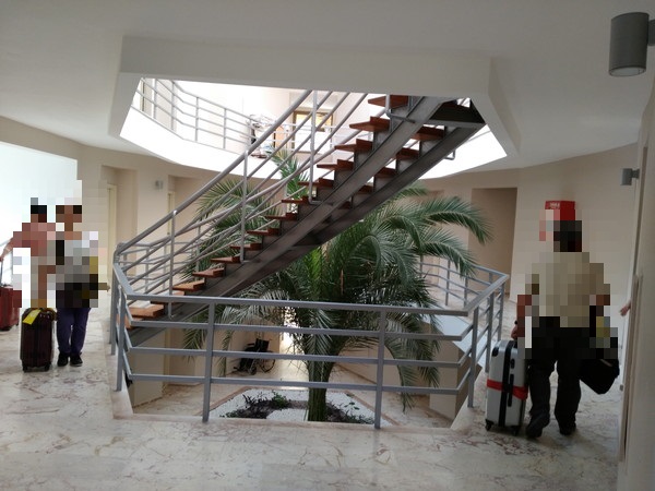 宿泊棟の内部は、中央に吹き抜けがありその周囲を円状に各部屋が配置されています。観葉植物も植えられておりお洒落な造りになっています。