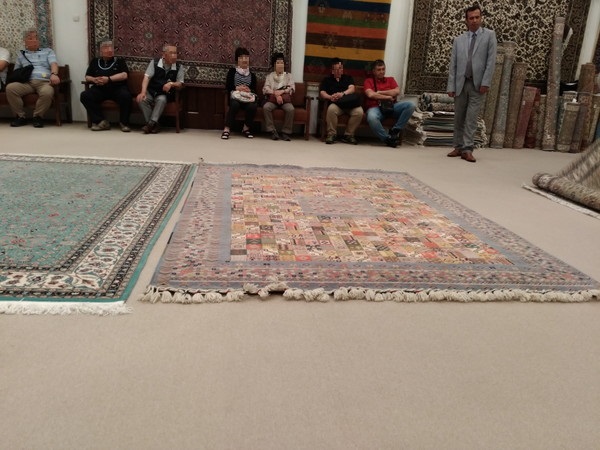説明が終わると別の部屋に移動し、いよいよ商談?が始まります。次から次へと各種絨毯の紹介がされますがどれも素晴らしくため息が出ます。絨毯の値段についてですが、大きいから高いというわけではなく、編みの細かさと完成するまでに掛かった期間に比例しているとのこと。数年以上の歳月を費やして完成した絨毯もありました。お値段は下は10万円から上は数百万まで。別の部屋には2000万の絨毯もあるとか。