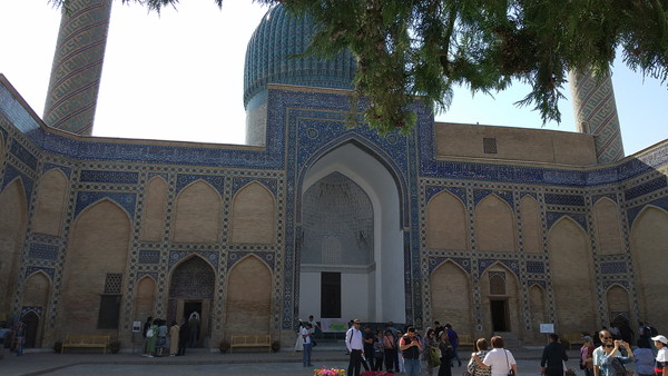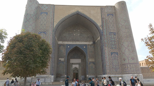 ビビハニム・モスクはかつてイスラム世界で最大を誇ったモスクで、167m×109mと巨大です。1399年、インド遠征から戻ったティムールは世界に比類のない壮大なモスクを造る決意をし、帝国各地から建築家や芸術家、労働者を集め、物資の輸送にはインド象が使われ、ティムール本人も現場監督に出向くほどの熱の入れようだったと言われています。ビビハニムという名前は、ティムールの奥さんの名前が由来だそうです。