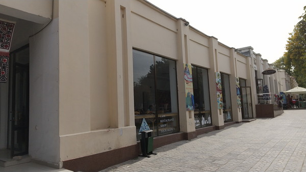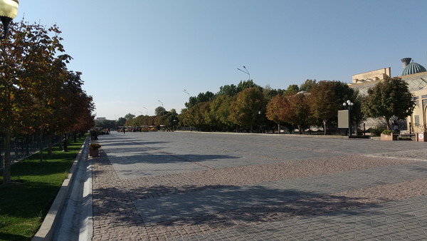 ホテルから歩くとすぐのところに、観光客で賑わう「カリモフ通り」があります。レギスタン広場の東側から北に延びる遊歩道で、約1kmの通り沿いには、レストランやカフェ、お土産屋さんが集中しており、ビビハニム・モスクやシヨブバザールもあります。両脇には緑美しい街路樹が植えられ、所々には休憩用のベンチなどもあります。自動車は乗り入れることができないため、代わりに電動カートが頻繁に行き来しています。カリモフ通りを南に向かってしばらく歩くと、レギスタン広場に到着です。