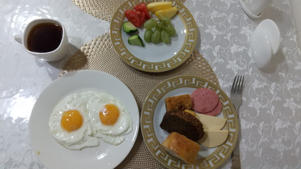 8時を過ぎたので、地下の朝食会場に向かいました。朝食はビュッフェ形式で、何種類かのパン、キュウリとトマト、葡萄やリンゴ、チーズやハムなどが提供されていました。一週間以上ウズベキスタンに滞在したので、だんだん分かってきたのですが、どこのホテルでも野菜はキュウリとトマトが定番のようです。逆に言うと、これ以外の野菜は入手するのが難しかったり高かったりするのかもしれません。これらのメニューに加え、キッチンにいる年配の女性の方が1品卵料理を作ってくれました。いくつか選択肢があったのですが、目玉焼きを頂きました。