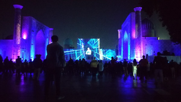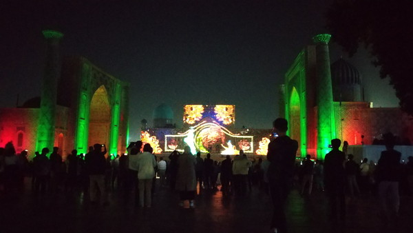 8時半を過ぎたので、レギスタン広場のライトアップを見に行きました。実は、昨晩も行ってみたのですが、ライトアップの開始時刻は20時~21時頃と幅があるようで、昨晩は20時ぐらいに行ったのですが、開始する気配がなく、疲れていたこともあってホテルに戻ってしまいました。今日は少し遅めに行ったのですが、これが裏目に出てしまい既にショーが始まっていました。広場前のショーが良く見える場所に行ってみると、大勢のお客さんが集まっていました。幸運なことに、今日は通常のライトアップ・ショーではなく、プロジェクションマッピング・ショーをやっていました。これは、不定期で開催されるもので、ネット上の情報によると、団体客などが料金を払った場合のみしか見れないようです。プロジェクション・マッピング・ショーでは、音楽に合わせてウズベキスタンやサマルカンドに関連する映像が次から次へと流されて大変見応えがありました。写真ではショーの迫力が上手く伝わらないのが残念なところです。
