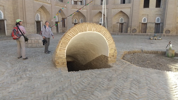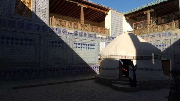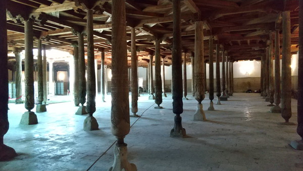 「ジュマ・モスク」は中央アジアでは類似のない珍しいモスクで、柱の上に平坦な天井がある構造になっています。古代アラビアのモスクに同様の構造のものがあったそうです。約3m間隔で213本の柱が立っています。建物内は広く、柱以外に特筆すべきものはなかったのですが、研究者と思われるグループが熱心に柱の写真を撮ったり寸法を測ったりしていました。
