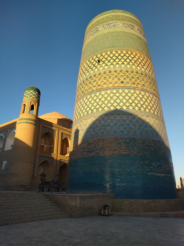 結論から言います。イチャン・カラは早朝が最高です。メインストリートは人影が少なく、鳥のさえずりと、箒を掃く音が聞こえるのみで、古のシルクロードにタイムスリップしたような感覚が味わえます。メインストリート周辺に見どころがコンパクトにまとまっており、小一時間散歩するにはちょうど良いボリュームなんですよね。また、早朝に限らず清掃作業をしている方が大勢いたのが印象に残っているのですが、イチャン・カラに限らず空港や鉄道駅など至る所が綺麗で、ゴミとかも全然落ちていなくて、こういった現地の方々の努力の賜物なんだなぁと感じ入りました。