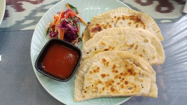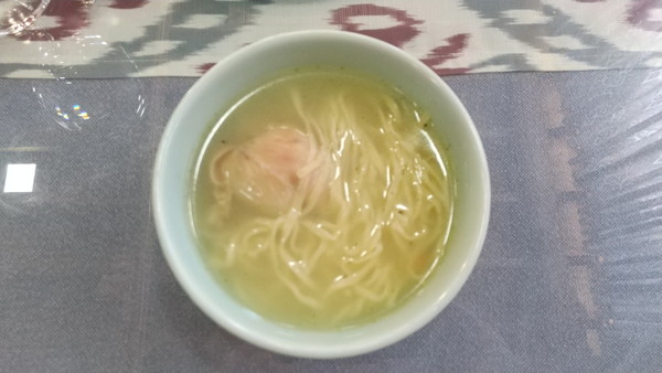 チキンスープは絶品でした。中華料理屋さんで出される鶏ガラスープに近く、一緒に入っていた細麺はラーメンみたいな食感でした。グンマは焼き立ての熱々で、中にはお肉と野菜がふんだんに入っており、口に入れるとあふれ出る肉汁が凄かったです。プロフは想像していたよりも油はきつくなく美味しく頂けました。