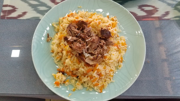 メニューは豊富でどれも美味しそうなんですが、一人ではいくつも食べられないのが悩むところです。迷いに迷った結果、チキンスープ(32,000スム≒約400円)、グンマ(60,000スム≒約700円)、プロフ(50,000スム≒約600円)を注文しました。