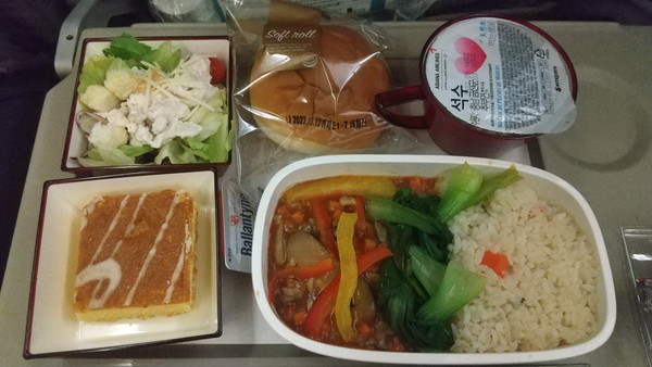 離陸後まもなく機内食が配られたのですが、食欲がなくて一口、二口食べて返却しています。かつ丼は美味しかったので勿体ないことをしました。