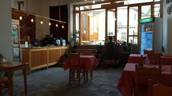 11時少し前に、ホテルをチェックアウトして荷物を預けた後は、最後の旧市街観光を楽しみました。何回も行った同じルートを行ったり来たりするだけですが、行く度に新しい発見もあったりして飽きることがありません。歩き疲れたのでホテルに戻ったのですが、まだ駅に移動するには早いので近くのカフェで時間を潰すことにしました。「Donuts & Coffee Bukhara」というお店で、外国人観光客に大変人気のある本格的なカフェなんだそうです。