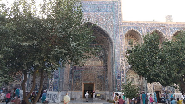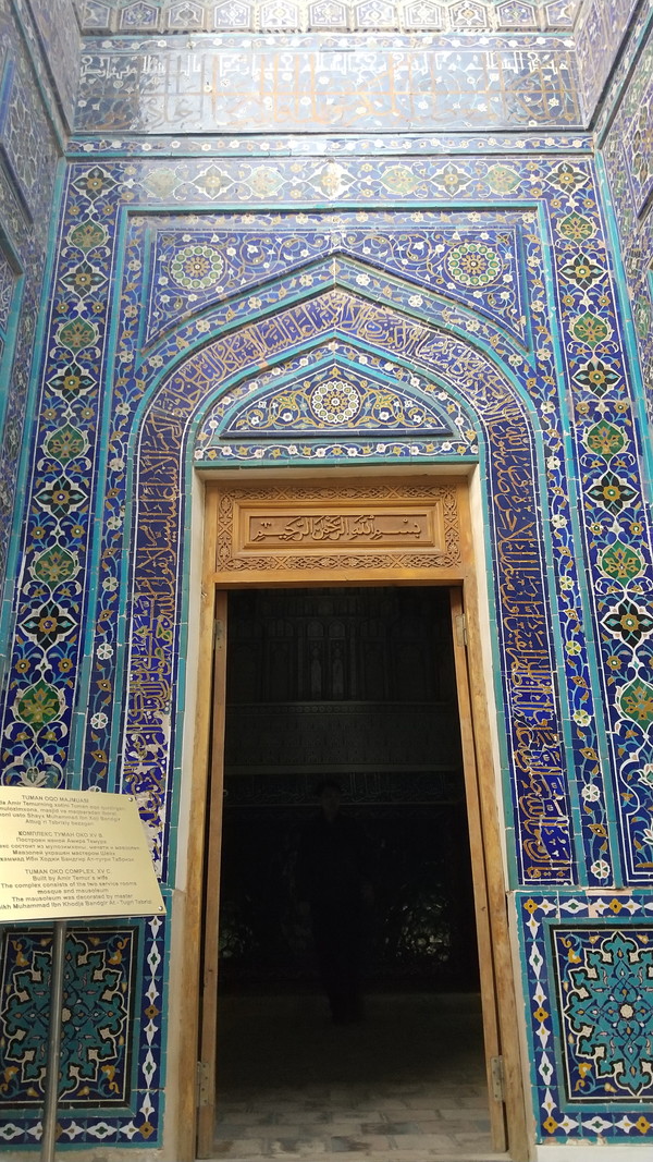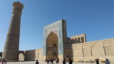 入口の門(ダウヴォザハナ)は、第4代君主ウルグ・ベクの命により建設されたものです。非常に大きな門ですが、門の前のスペースが狭くて、正面からだとカメラに収まりません。斜めからようやく全景が撮れました。
