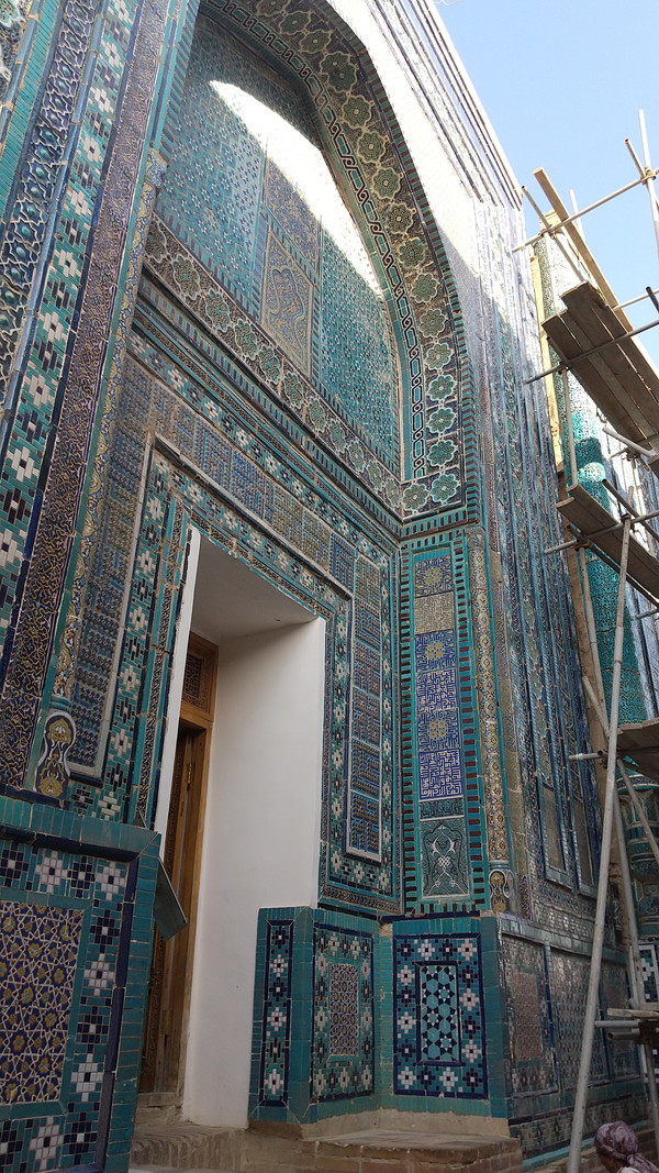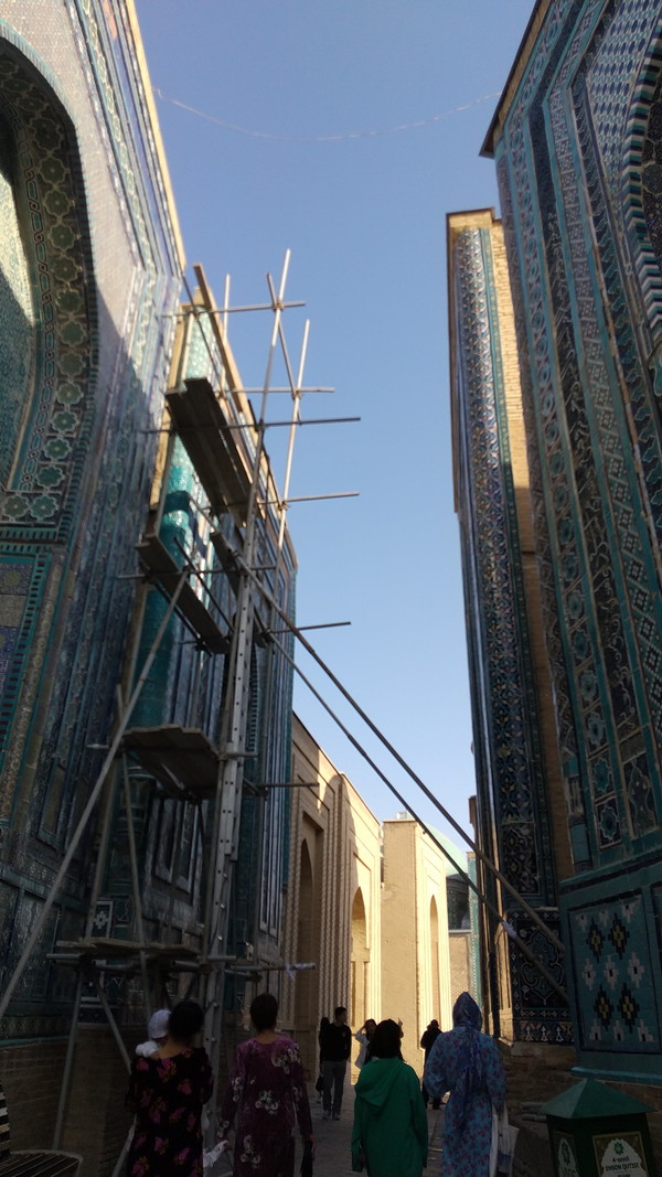 階段を登ったところにあるアーチをくぐると、左右に青色の霊廟が並ぶ回廊があるのですが、ここがシャーヒズィンダ群廟の中で抜群に美しいと言われている場所です。ガイドブックなどでおなじみの景観で、私も含め観光客の多くはこの景観を見るために、はるばる中央アジアまで来るのですw しかし、何と言うことか、私が行ったタイミングでは改修作業が行われていたようで、霊廟の前に足場が作られていました。これを見たときは非常に落胆しましたね。よりによってこの場所とは!予報に反して、空はまだ抜けるような晴天が続いていたたので、絶好のシャッターチャンスだっただけに本当に残念でした。まあ、巡り合わせが悪かったと諦めるしかありません。