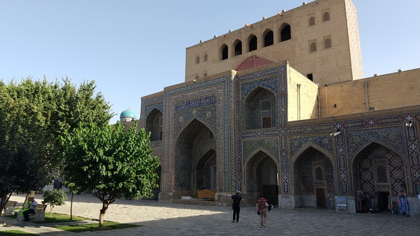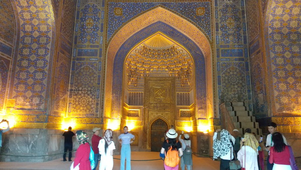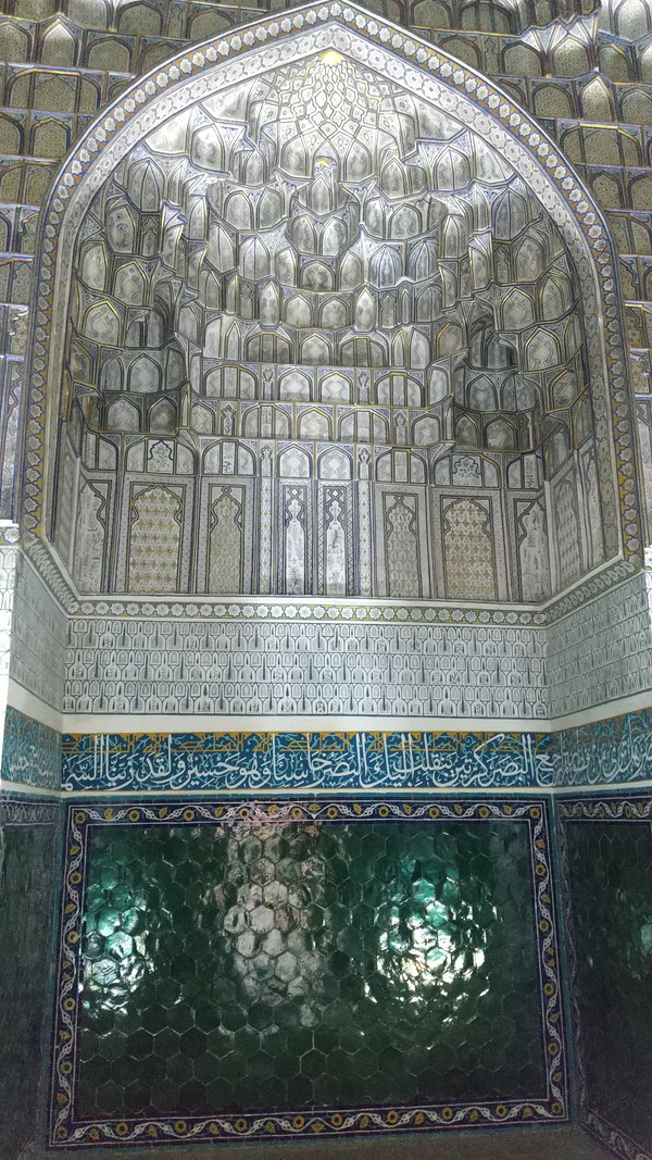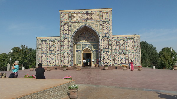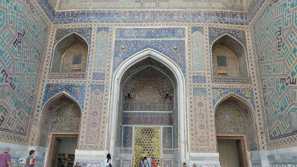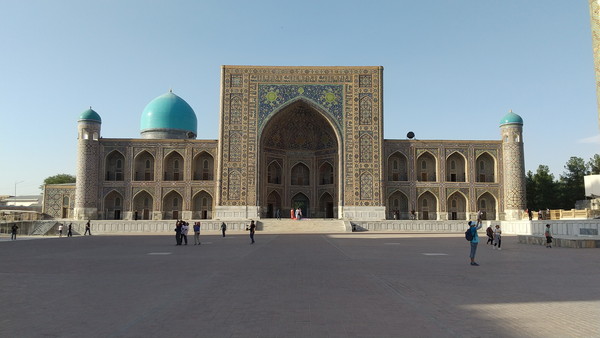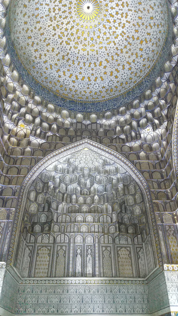 足場の件は残念でしたが、それを差し引いても、期待以上の凄さでした。昨日のグーリ・アミール廟に続き、毎日素晴らしいもの拝見させて頂いています。以前、言及したブハラとの比較の話になりますが、街全体の雰囲気はブハラに軍配が上がるものの、このような圧倒的なインパクトのある建築物はなかったんですよね。サマルカンドに来た直後は、街全体の雰囲気が思った以上に近代的で肩透かしを食らった感じもあったのですが、時間が経つにつれて、やはりサマルカンドは凄いな、ティムール朝の都だっただけのことはあるなぁという実感が湧いてきました。