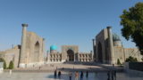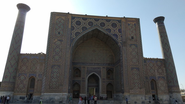 まずは広場の西側にある「ウルグ・ベク・メドレセ」から見て行きます。この時間帯だと逆光気味で上手くカメラに収めることができませんでした。肉眼で見ると、建物の装飾が見事でついつい見入ってしまうのですが、上手く伝わりませんね。