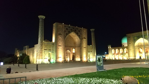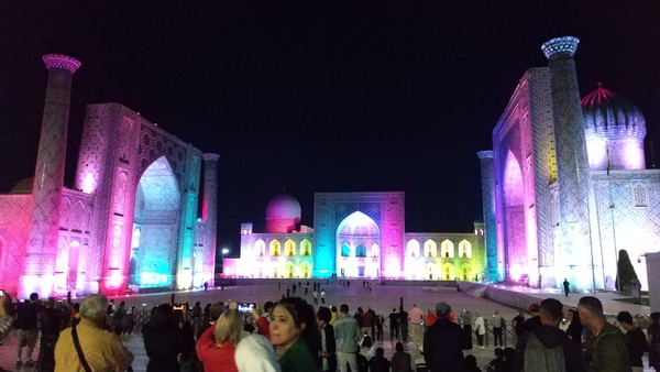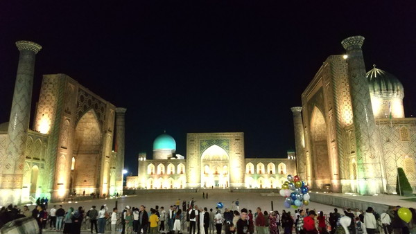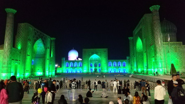 明日は午後からタシケントに移動するため、今晩がレギスタン広場のライトアップ・ショーを見れる最後のチャンスです。20時を過ぎた頃に行ってみました。今晩も広場は大勢の観光客で賑わっています。しばらく待つこと30分、ライトアップ・ショーが始まりました。