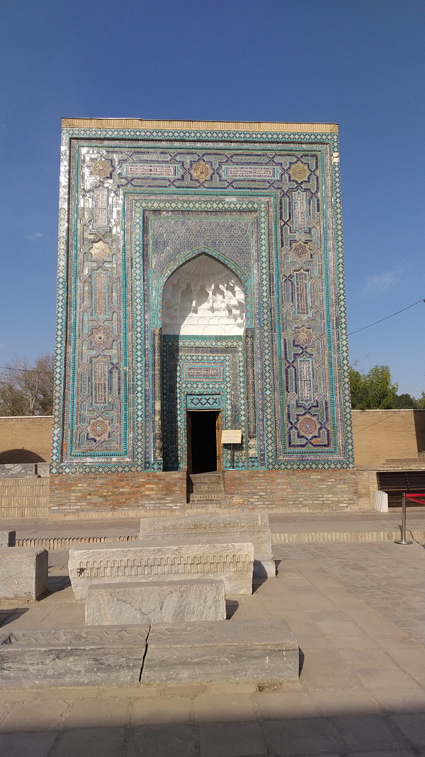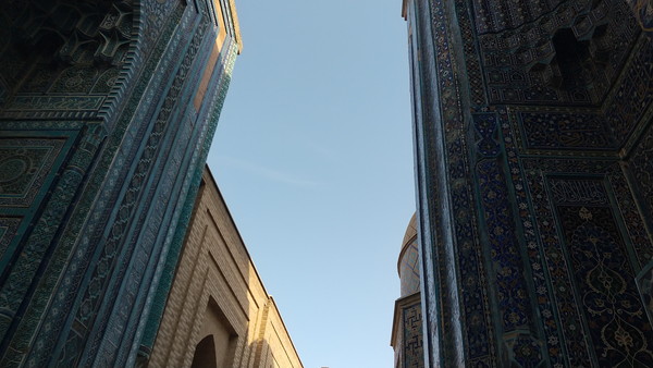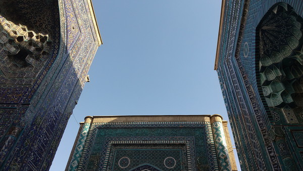 さらに進むと最後のアーチがあり、これをくぐると最奥部に到達です。こちらも3つの青の霊廟に囲まれた素晴らしい景観で、何というか、シルクロードというよりは、SF映画の一場面にあるような、どこか遠い宇宙の彼方の異空間に降り立ったような印象を受けました。