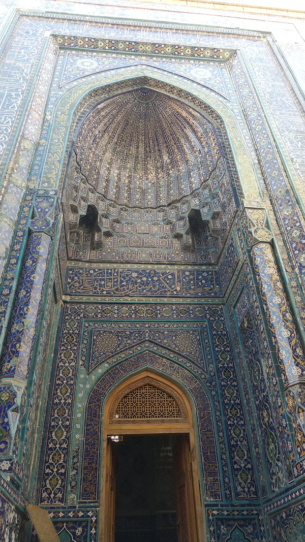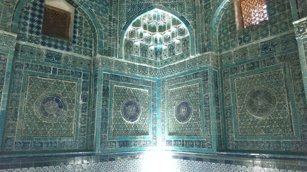 シャーヒズィンダ廟群で最も美しいと言われているのが、左奥にある「シャーディムルク・アカ廟」で、ティムールが愛した姪を祀ったものです。霊廟内部は評判通りの見事さで、四方の壁から天井のドームまで至る所が、美しい青タイルの装飾が施されています。この時間帯は観光客が少なくて、ゆっくり見学できたのが幸いです。