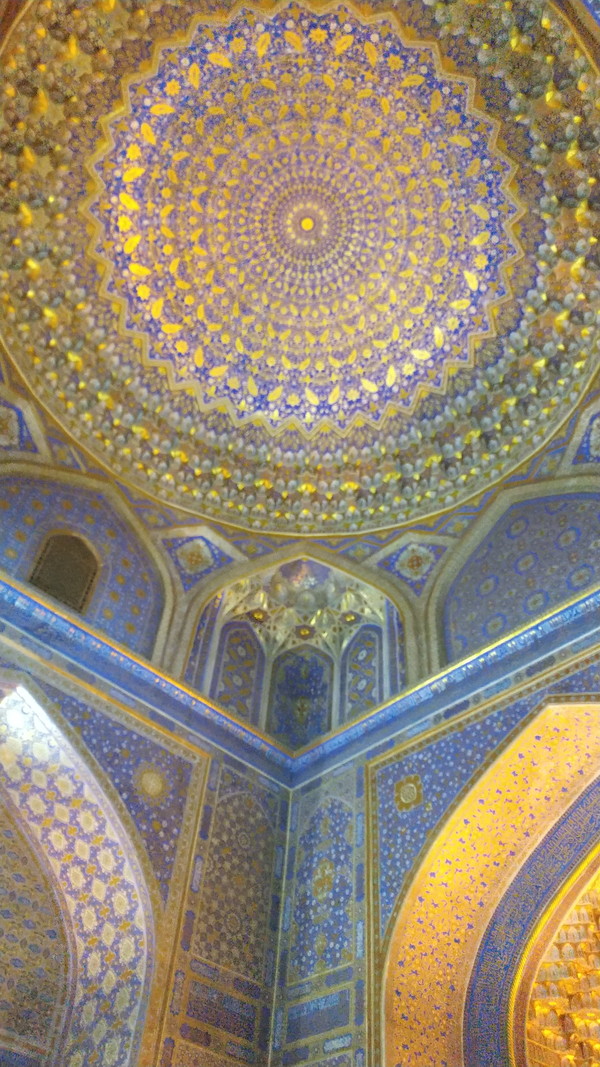 青色のドームの中は、礼拝所になっており、黄金に覆われた素晴らしい装飾が施されています。ティラカリ・メドレセの「ティラカリ」とは「金箔された」という意味で、その名の通り眩いばかりの緊迫で覆われているのが分かります。